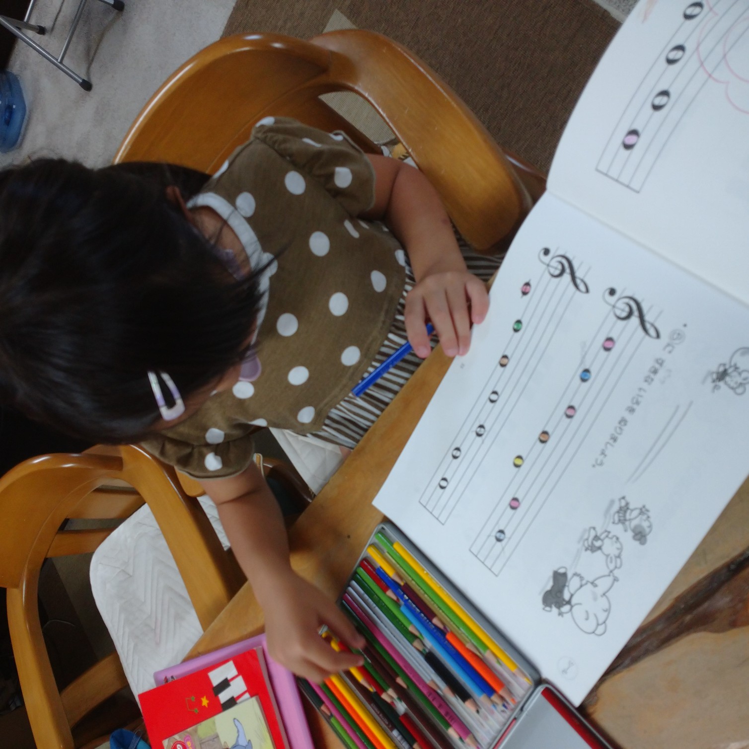 緊急事態宣言明けの6月からピアノを始めた生徒さん、音符の色ぬりもスムーズになり