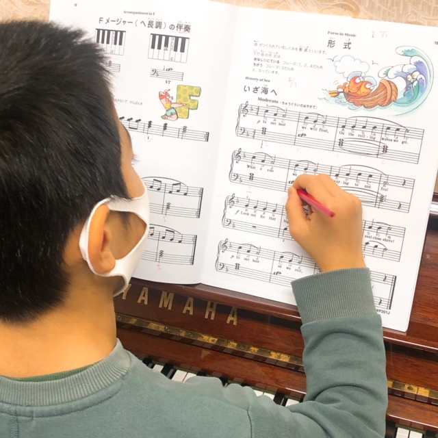 Ⅰの和音とⅤの和音で構成されている曲を学び、小節ごとにどのコードなのかを楽譜に書き込んでもらいました😊