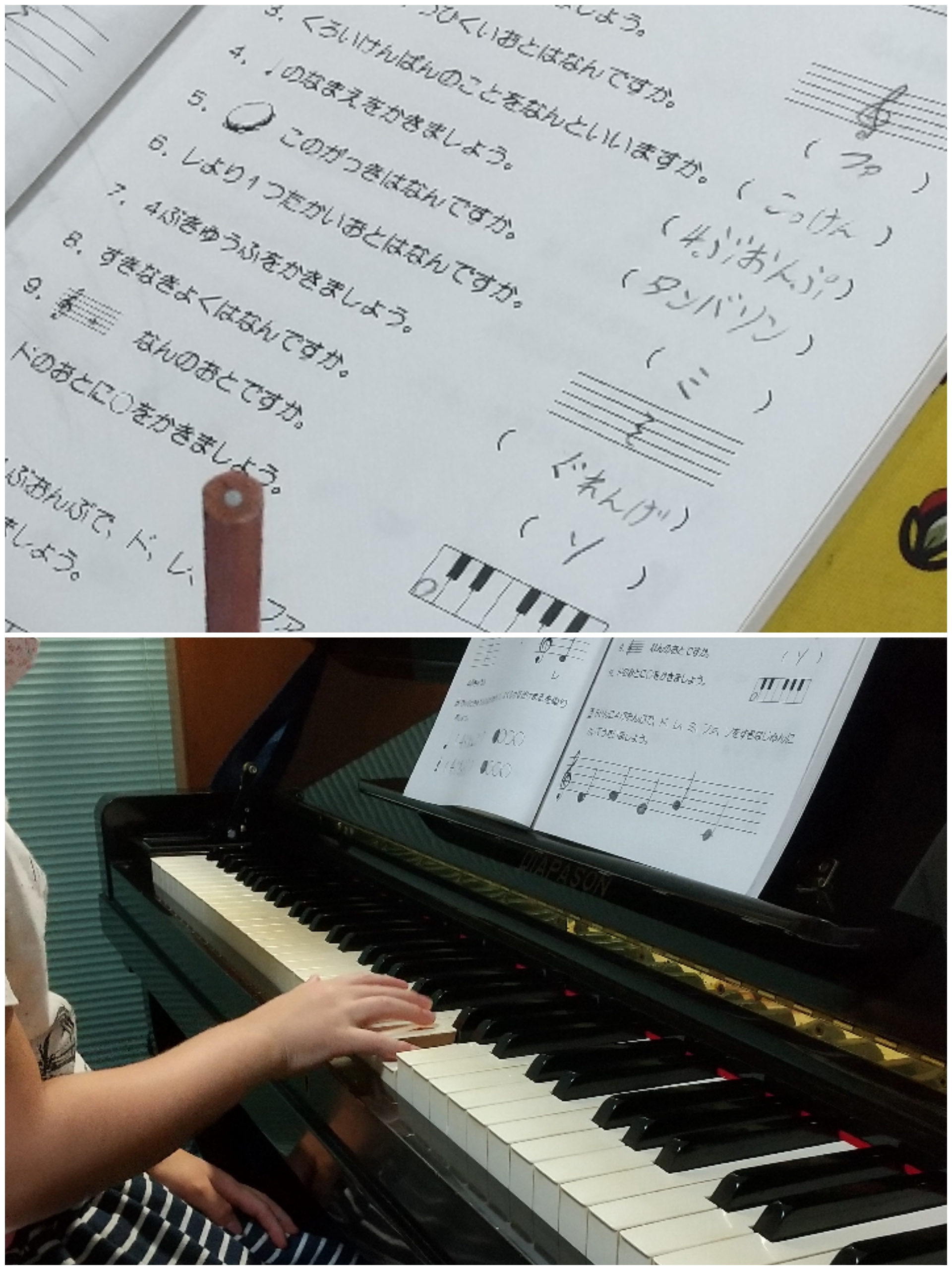 ピアノを弾く前、音楽ドリルに取り組むSちゃん。