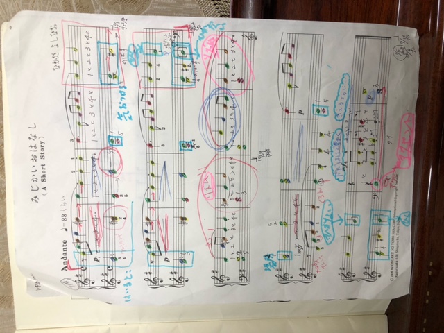 お楽しみ会ギリギリまで暗譜ができなかったYちゃんが最後のレッスンで危機感を持ったのか、自分で楽譜に注意点を書き込んでいました😳!!