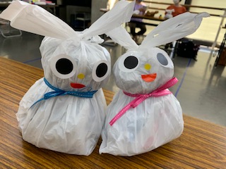 写真は先日の講習会のもの。スーパーの袋に新聞紙を詰めてシールを貼れば簡単にウサギさんの出来上がり🐰
