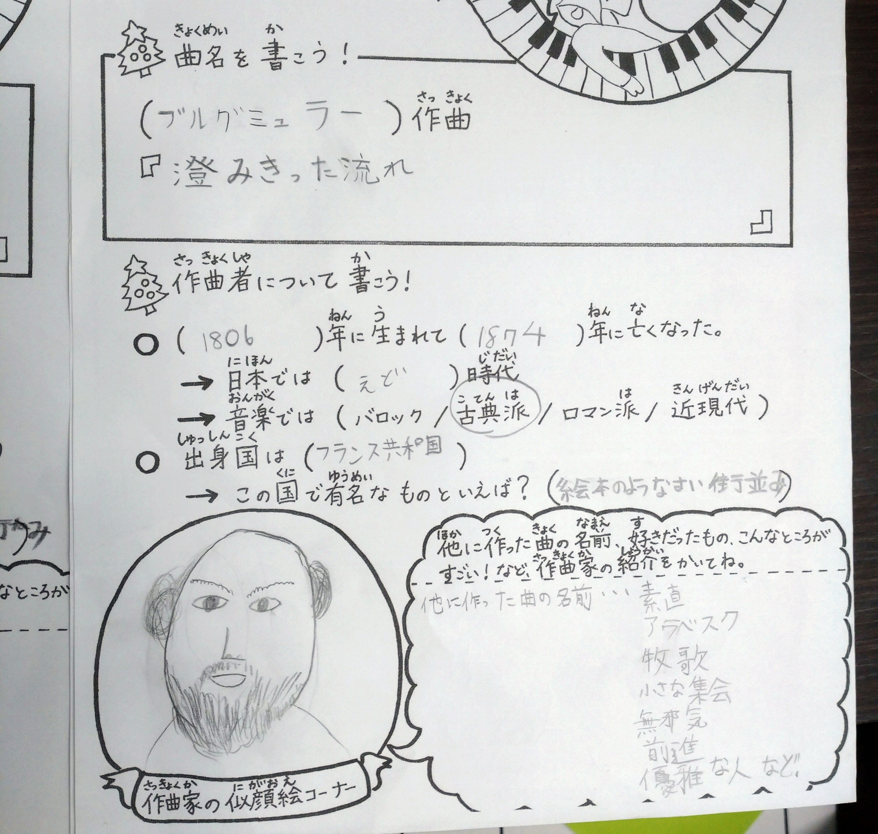 今回お楽しみ会で各自演奏する曲について書いてきてね、と配布したところ
