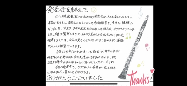 私はクラリネット指導はしていないし、直接Tちゃんのレッスンに立ち会うことは無いのですが、発表会や教室行事を通じて信頼してくれてるんだなぁと感じ、また教室を好きでいてくれることが伝わってくるんです✨