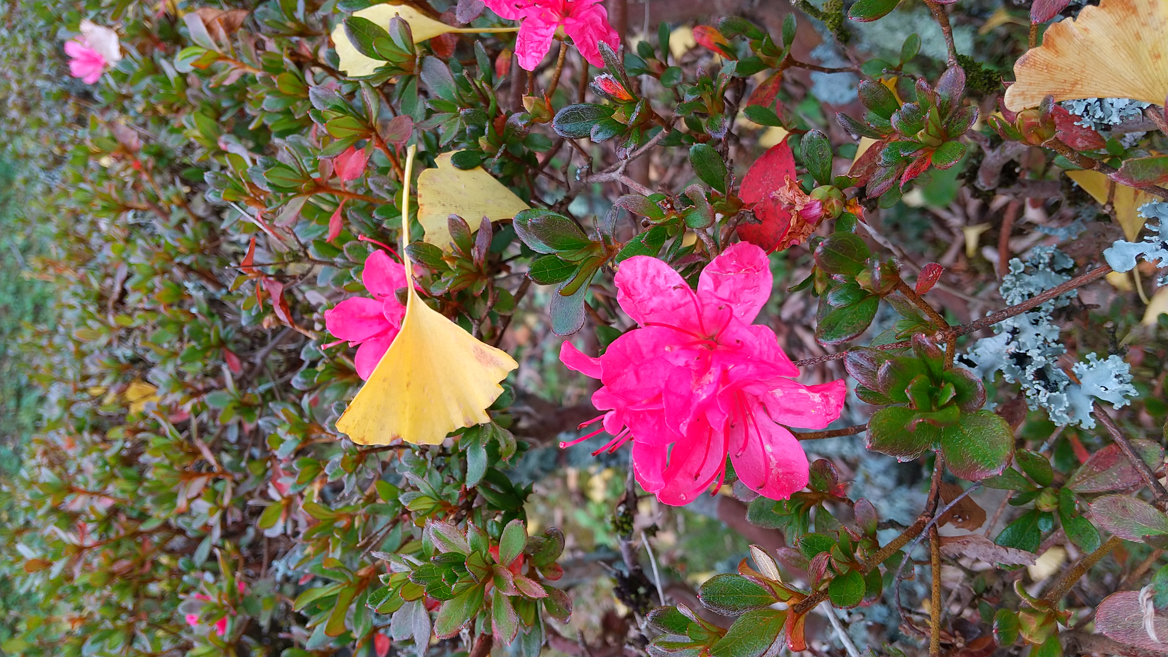 季節外れの桜…というニュースをたまに聞きますが、イチョウ並木の片隅にツツジの花が